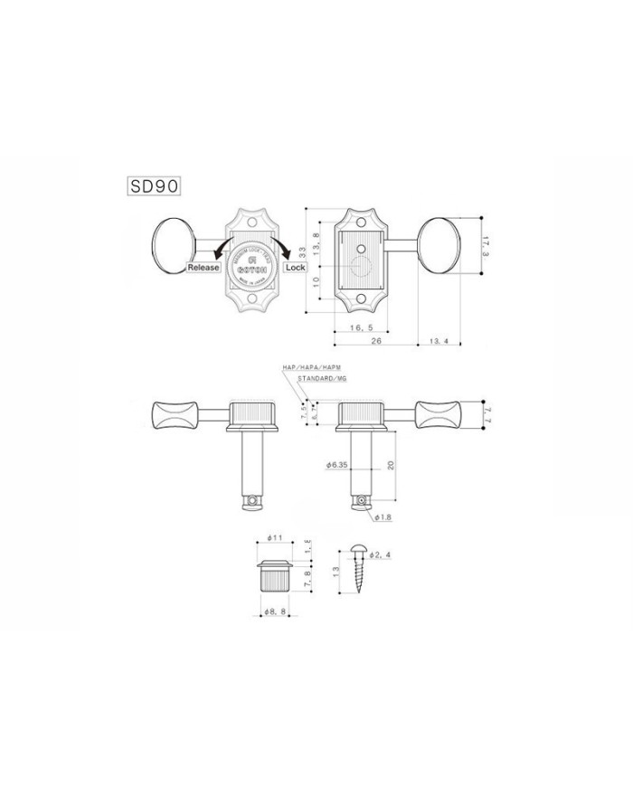 Diameter of the holes in the guitar head (peghead) 11/32 "(8,73mm) Diameters of the axes 1/4" (6,35mm)> suitable for replacement of mechanics of vintage and reissues models made in USA