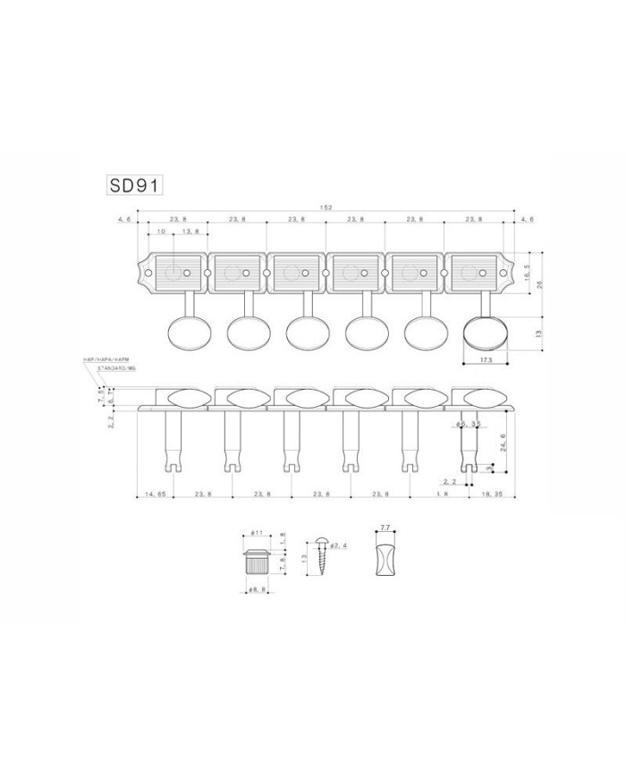6x in Line Tuning Pegs (Left side for Right Handed players). Holes diameter in the head of the guitar (peghead) : 11/32 "(8,73mm) Diameters of the Post: 1/4" (6,35mm)> suitable for replacing the Tuners of vintage and reissues models