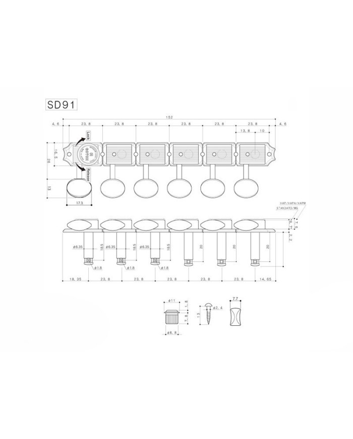 Peghead Holes Diameter peghead 11/32" (8,73mm) Posts Diameter 1/4" (6,35mm)
