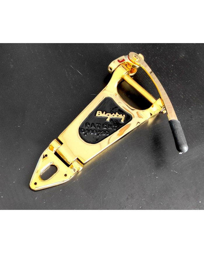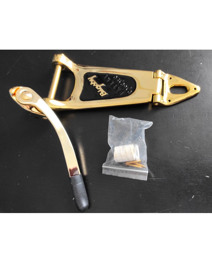 Genuine Bigsby B6 Vibrato Tailpiece Aluminium Body Gold Finish. Does Not Include Bridge. Designed for Large Hollow Body Archtop - jazz guitars with floating jazz style bridge, such As Gretsch® 6120 or Gibson® Super 400...Series: Original Kalamazoo Line -Manufacturing Method: Sand Cast - Manufacturing Material: Aluminum - Approximate weight: 311 grams /11 oz. Overall Length: 9 1/4”/235 mm Overall Width: 3 5/8”/ 92.1 mm Arm adjusts with 1/8” Allen wrench and 5/16” socket wrench.