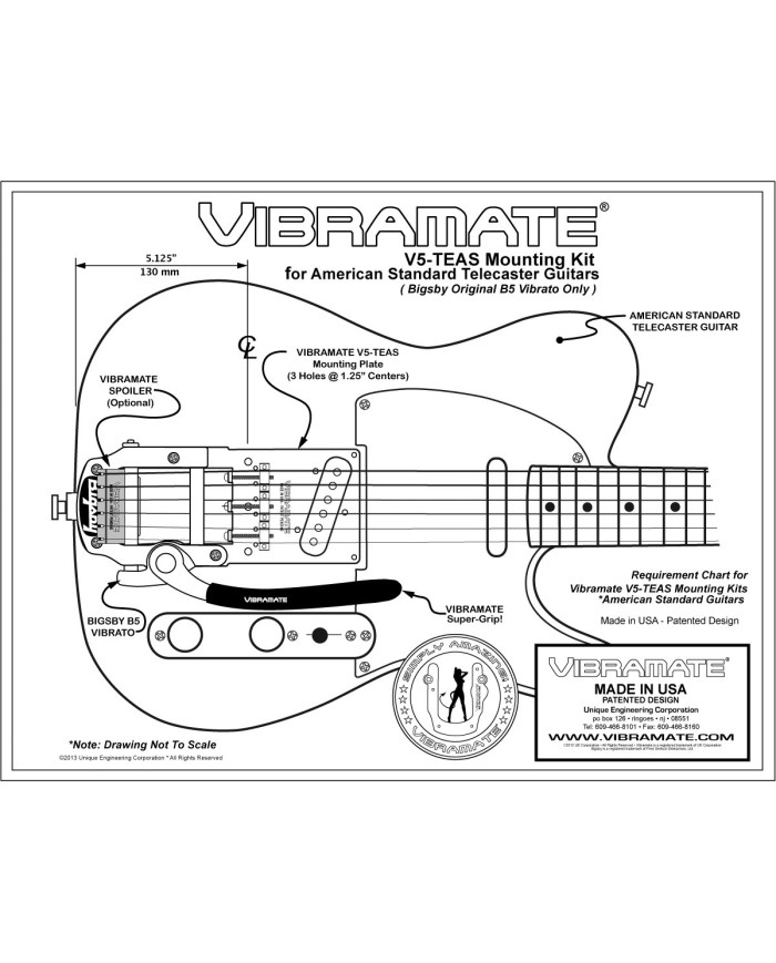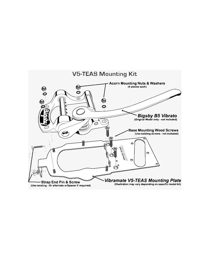 The Vibramate V5-TEAS Model Mounting Kit is designed for a Bigsby B5 Vibrato and will fit most American Standard Telecaster guitars that have a 3-screw mount bridge.The Vibramate V5-TEAS kit includes mounting hardware for the Bigsby B5 Vibrato and utilizes your existing Telecaster pickup and mounting hardware. There is no need for drilling, soldering or removing the neck. Conversion to 3 Saddle design is required for the Bigsby to work properly.