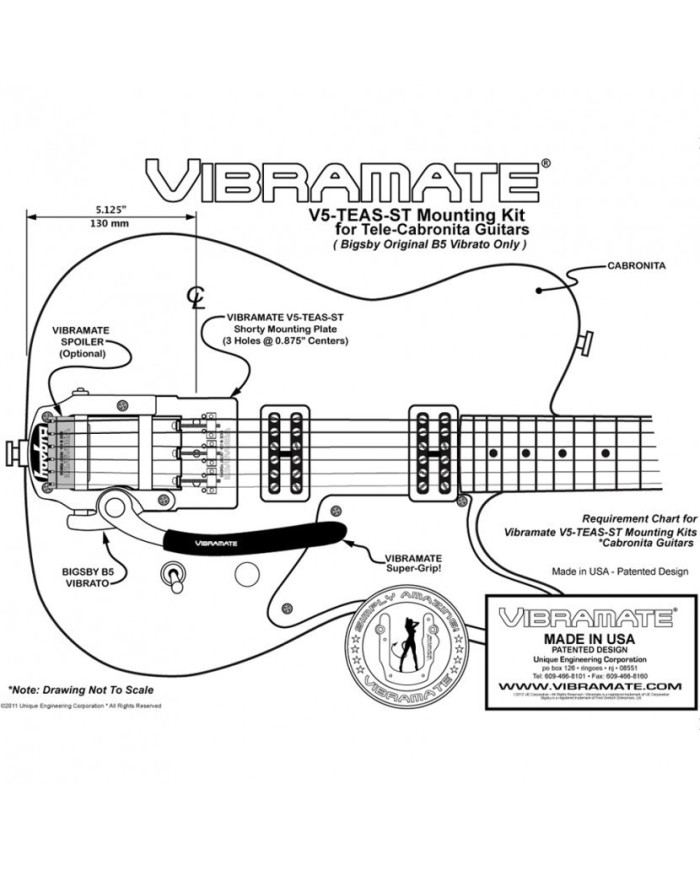The Vibramate V5-TEAS Model Mounting Kit is designed for a Bigsby B5 Vibrato and will fit most American Standard Telecaster guitars that have a 3-screw mount bridge. The Vibramate V5-TEAS kit includes mounting hardware for the Bigsby B5 Vibrato and utilizes your existing Telecaster pickup and mounting hardware. There is no need for drilling, soldering or removing the neck.