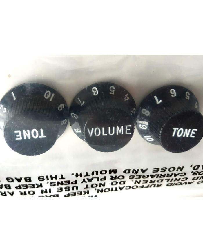 Genuine Fender® Original Series knobs for Stratocaster®. Black. Includes one volume and two tone knobs.