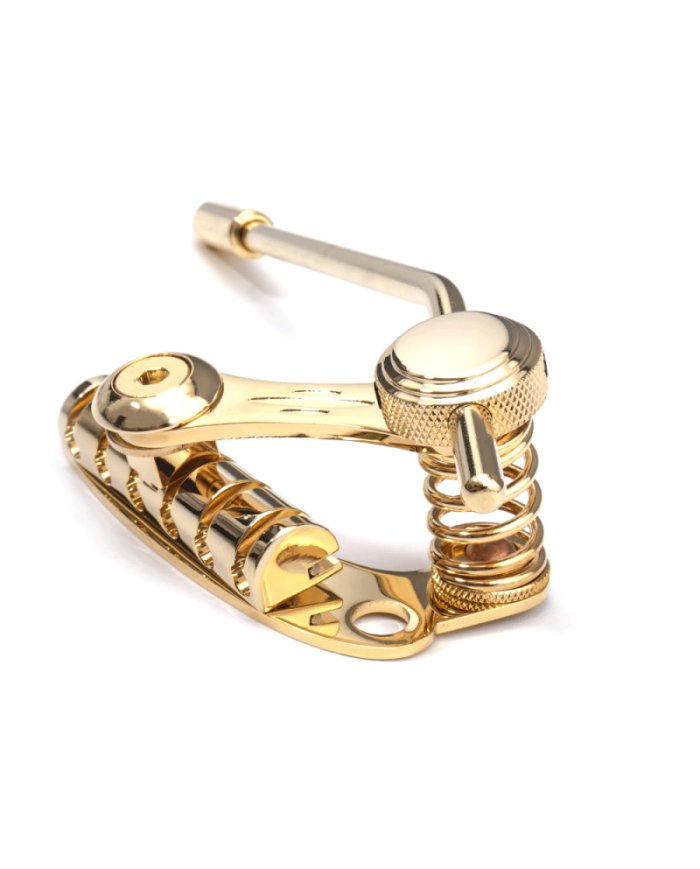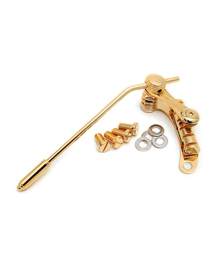 Duesenberg Tremolo guarantees the least amount of friction and maintaining the highest tolerances for your guitar. With our specially designed tailpiece and tremolo arm, your Doozy will stay in-tune and give you the sweetest tone with the fully adjustable tremolo arm. Duesenberg Les Trem II Gold TM85G, vibrato system for guitars with stop tail piece, mounting to the stop tailpieces jacks, no drilling or milling required, simply screw in the two existing threaded sleeves, new version with round handle for optimum handling, included 4 mounting screws 2 x metric 2 x inch, Gold finish.
