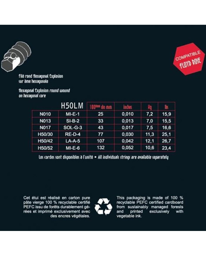 These strings are made of a hexagonal core wrapped with nickel-plated metal wire, offering comfort, accuracy, and responsiveness. Their perfect compatibility with Floyd Rose vibratos ensures flawless tuning, even during intensive effects.