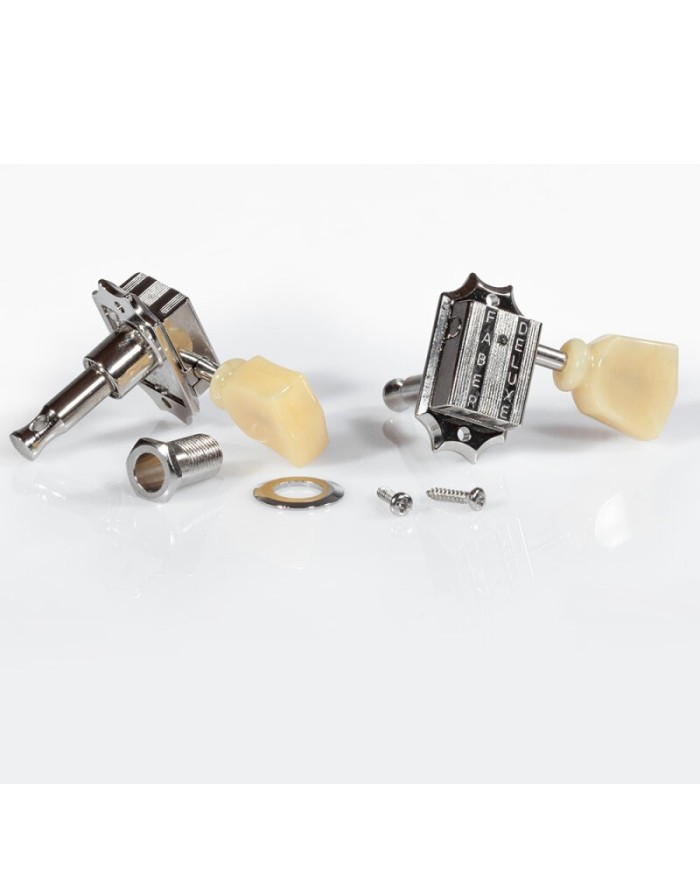 Traditional model in stamped steel with press-fit bushings (direct replacement for many Gibson® guitars), with vintage style pearloid trapezoid tuning keys.
