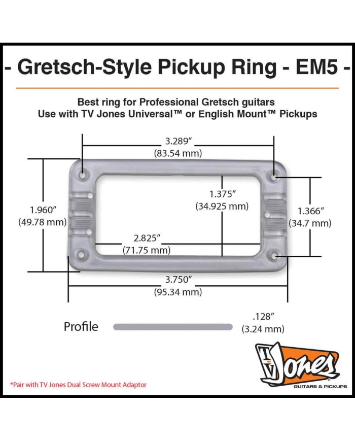 Whether you call it a ring, bezel, or surround, this EM5 Gretsch-style Pickup Ring will get the job done with style and ease. Straight from the source, these are official Gretsch-style rings that have two screw holes for use with our Dual Screw Mount Adapter. Fitting perfectly with our Universal Mount and English Mount (Filter'Tron sized pickups), the ring mounts directly to the guitar and the pickup suspends from the ring. Comes with one ring and four screws.