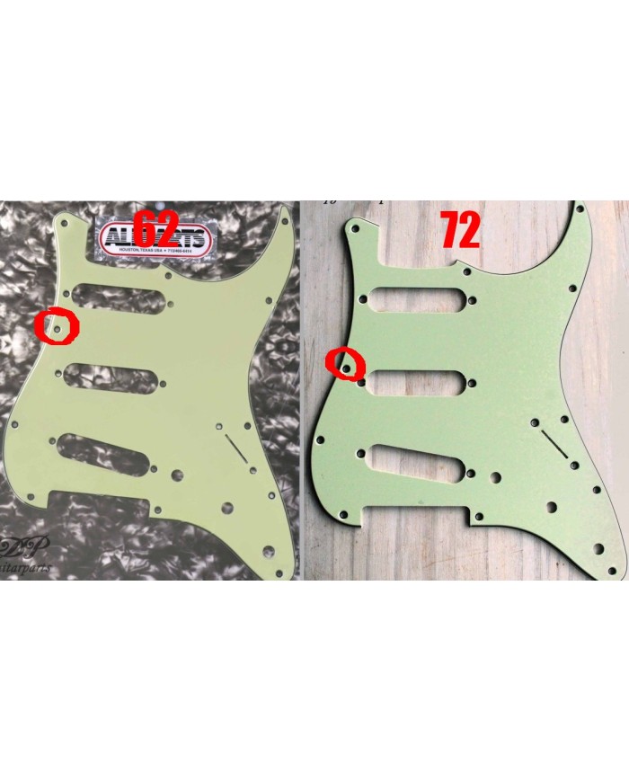 Strat®Pickguard SSS 3 ply 11 holes .090" (2,3mm) 62's Hole Patterns Common on Stratocaster L series unitil 1964 (Reissues or pickguard 60's - series: 60-64). Standard pickguard size type 62s with screw shifted to the left above the central pickup.