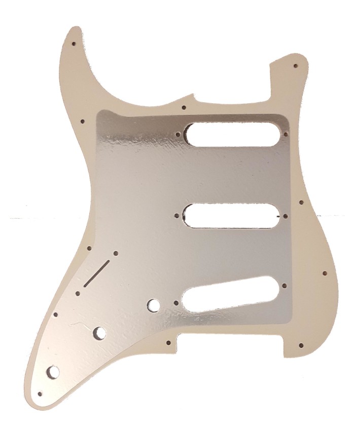 1 ply 11 holes White Stratocaster® Pickguard. Glossy white (shiny White - high gloss). Potentiometer holes 1cm diameter. thickness 0.090 "(2.3mm). Shielding on the back. Very good quality for a low price!
