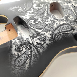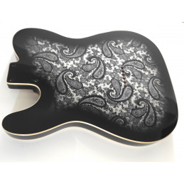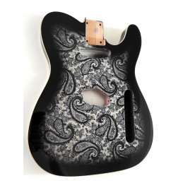 3-piece alder body Telecatser style varnish. Black Paisley Finish, Double binding