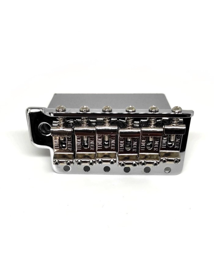 Six saddle vintage-style bridge assembly with stamped steel saddles. Vintage 2-3/16" mounting spacing. Die-cast tremolo block design. Threading will accept standard 10/32 tremolo arm.