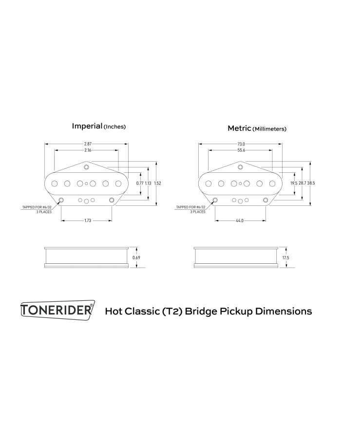 The neck pickup features Tonerider’s in-house nickel-silver cover, chosen for its excellent tonal transparency. Warm lows, sweet mids and clean, detailed highs make it ideal for rhythm work as well as expressive lead lines.