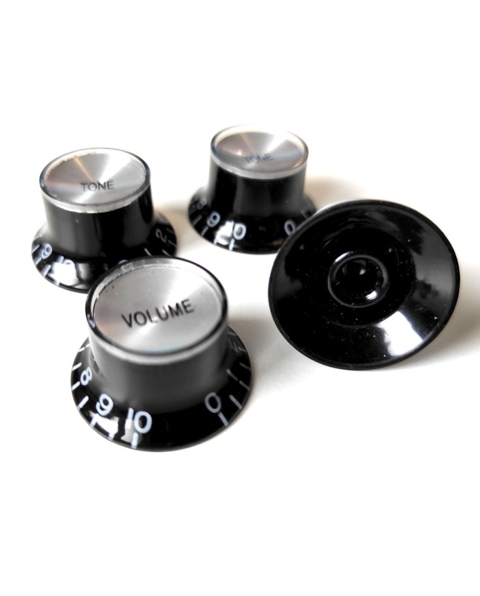 4 BOUTONS PLEXI NOIRS "TopHat, Silver reflector" 2 vol + 2 Tone Style Gibson (SG) inch Size (24 dents/teeth *) Numeros Gravés