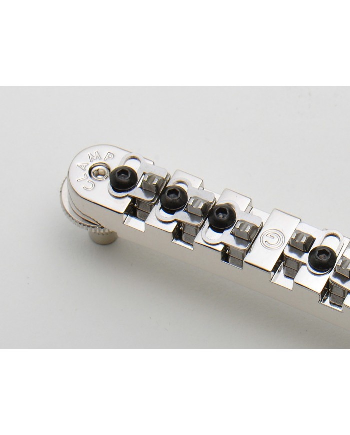 Pour régler les positions d'octave des pontets, desserrez les vis de blocage par le haut, et chaque pontet peut être déplacée vers sa position optimale. Autre caractéristique pour le confort de jeu : l'écartement des cordes est de 53 mm (corde à corde de 10,6 mm), soit 1 mm de plus que les Tunamatics classiques.