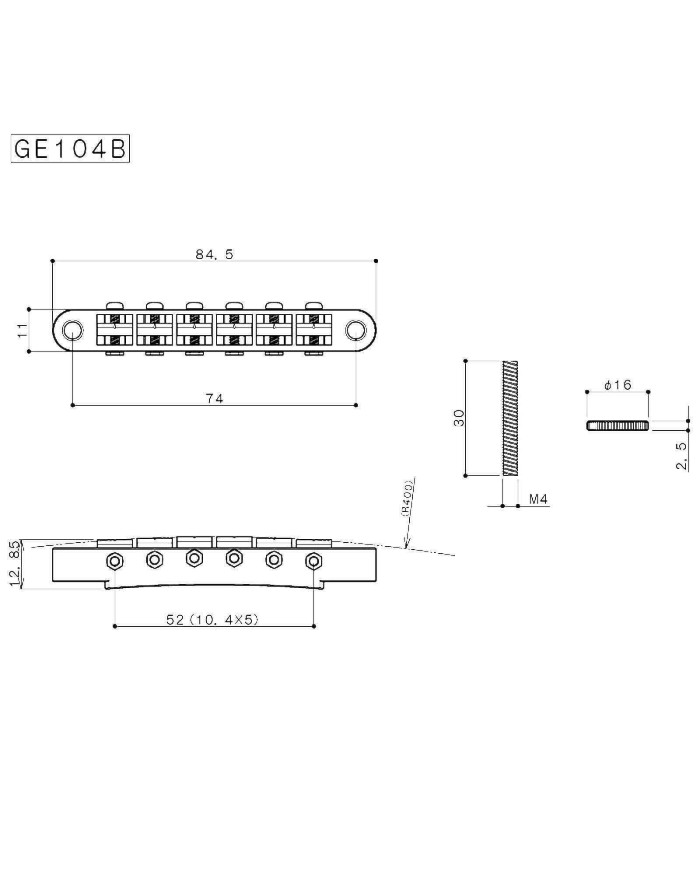 Chevalet type Tune-O-Matic 6 pontets indépendants en Zinc dur pour guitares style GIBSON® Les Paul®, SG, ES,... Contrairement au modèle Gotoh GE103B qui est plus large (14mm), le modèle GE104B reproduit le modèle classique ABR-1 (largeur 11,15mm). En prise direct sur le bois de la guitare sans l'intermédiaire d'un insert (stud/bushing) pour une sonorité "vintage"