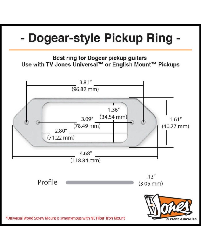Remarque : les Filter'Trons d'origine Gretsch et TV Jones Filter'Trons ont un rayon d'angle net de 1/4 pouce. Certains micros Filter'Tron de style Gretsch modernes sont fabriqués avec des coins plus carrés et peuvent ne pas s'adapter à cette bague.