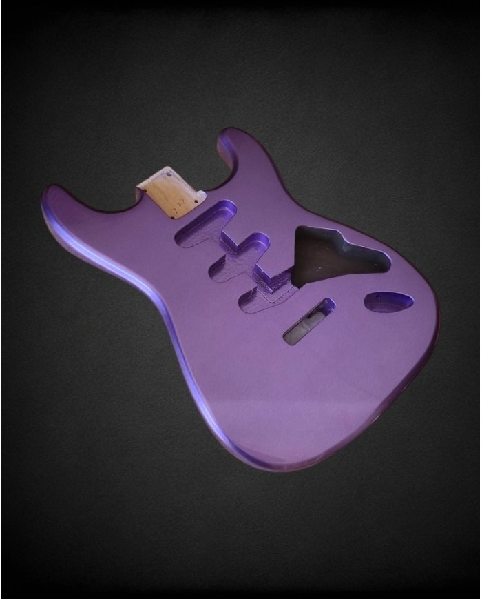 Un corps Stratocaster qui ne ressemble à aucun autre. Le violet metallic en poly gloss, c'est une couleur profonde, changeante — lilas sous certains éclairages, violet intense sous d'autres. Les paillettes métalliques font le reste. Sur scène, ça claque.