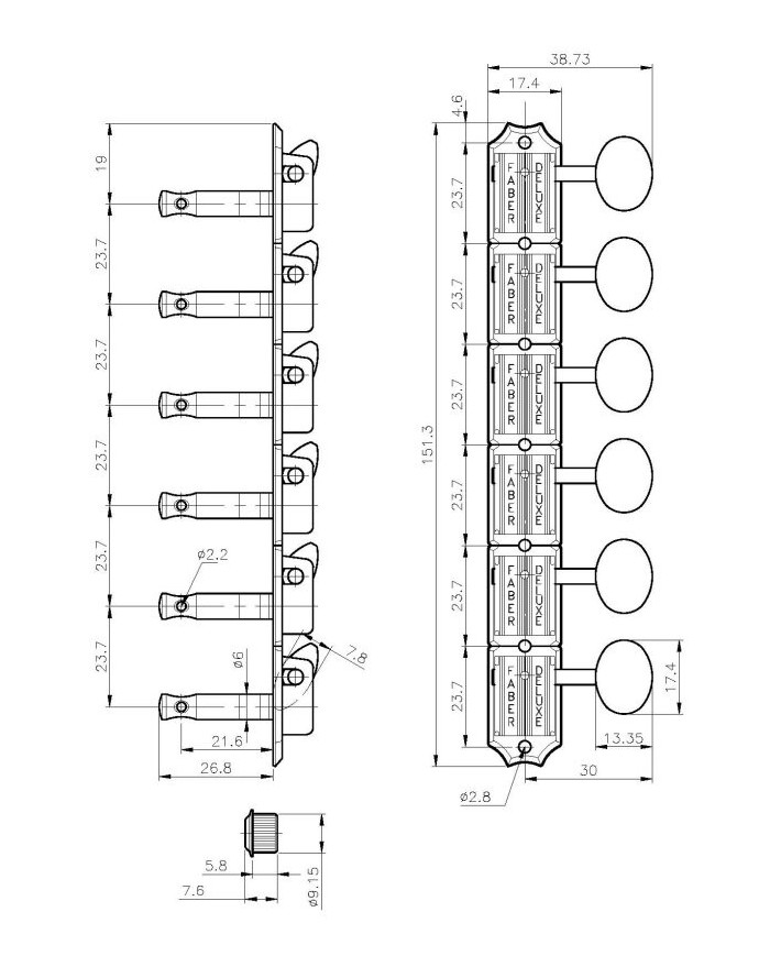 Mécaniques Faber 6 en ligne, bouton rond, or glossy