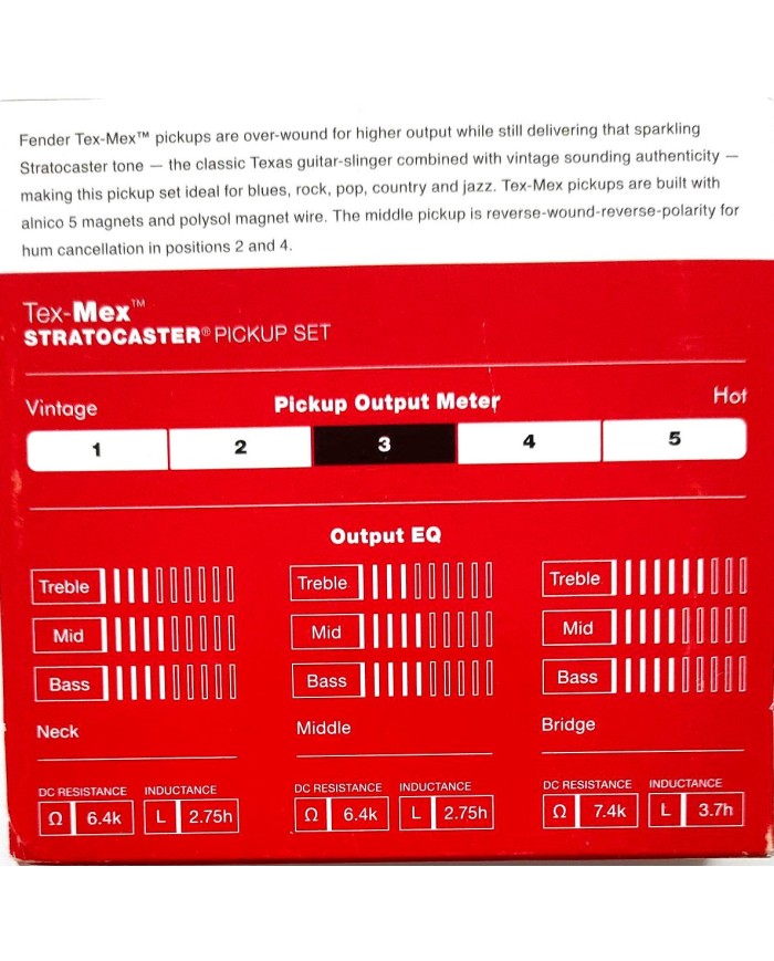 Les micros Fender Tex-Mex Strat sont livrés avec toutes les pièces nécessaires à l'installation, y compris : Vis de montage Tube de réglage de la hauteur du ramasseur Schéma de câblage