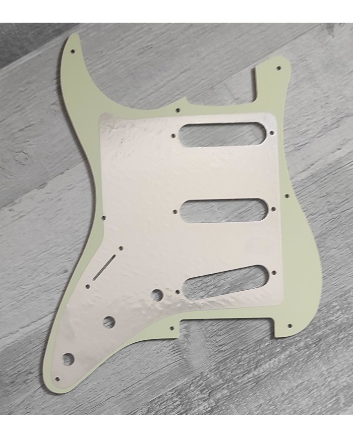 Pickguard Mint green 3ply 8trous pour Stratocaster style 57-62's, conviens aux pots US 10 mm. Trous de potentiomètres diamètre 1cm. épaisseur 0.090" (2,3mm). Blindage au dos. Tres bonne qualité pour un petit prix !
