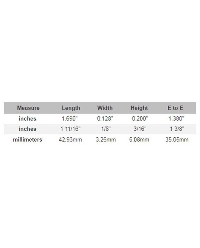 Peut être adapté aux cavités droites et incurvées* Meas. Thick / Epaisseur Length / Largeur Height / Hauteur E to E Appr. In. 1/8" 1 11/16" 3/16" 1 3/8" Inches 0.134 1.69 0.2 1.38 Mm 3.4 42.93 5.08 35.05 * s'adapte exactement aux manches Fender® à radius prononcé (vintage 7"25, standard 9"5) en coupant ou rognant le petit ergot central (avec un cutter et/ou une petite lime)