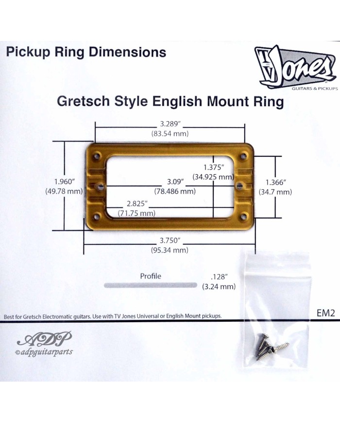 Ce contour EM2 pour Gretsch est un contour officiel de Gretsch qui a été modifié pour permettre de l'utiliser avec les micros TV Jones à montage suspendu. S'adaptant parfaitement à la monture universelle (micros de la taille de Filter'Tron), le contour se monte directement sur la guitare et le micro est suspendu dessus. Chaque contour de montage est livré avec quatre vis de montage.