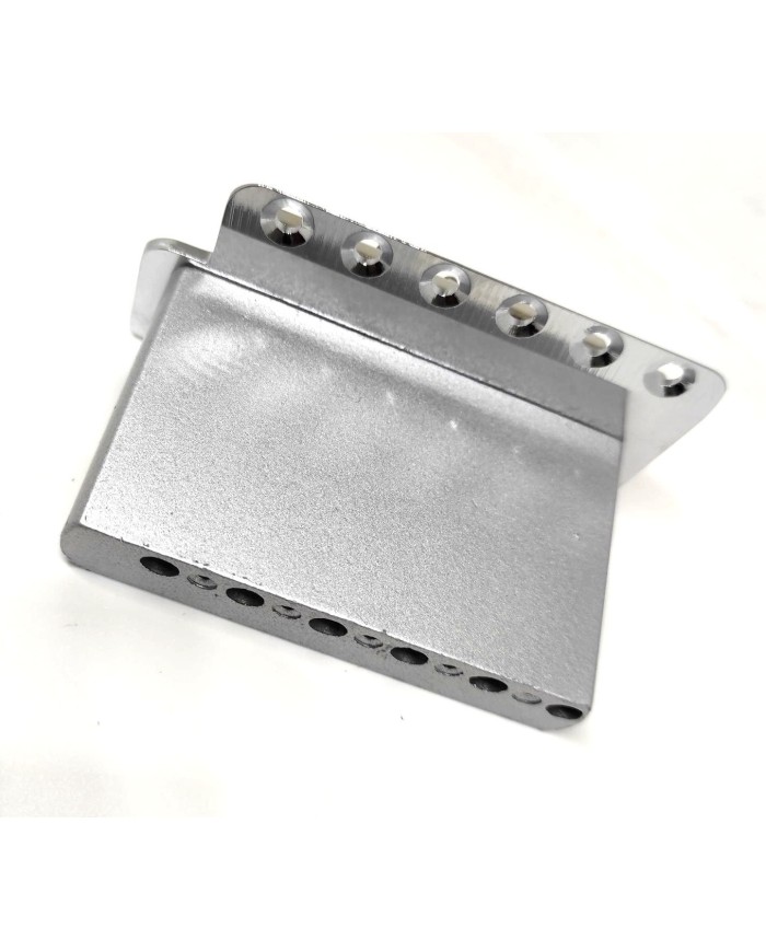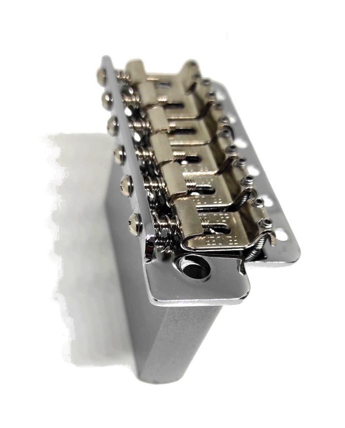 Chevalet de style vintage à six pontets en acier estampé. Espacement de montage vintage de 2-3/16 ". Bloc de trémolo moulé sous pression. Le filetage accepte le bras de trémolo standard 10/32.