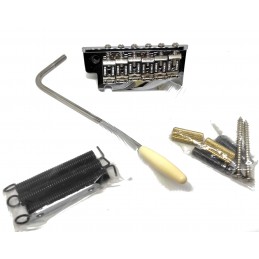 Comprend six pontets en acier pliées estampées «Fender», des vis et des inserts de pivot de pont, une griffe et des ressorts de trémolo, des clés de réglage, un bras de trémolo à visser avec une pointe blanche et le matériel de montage.