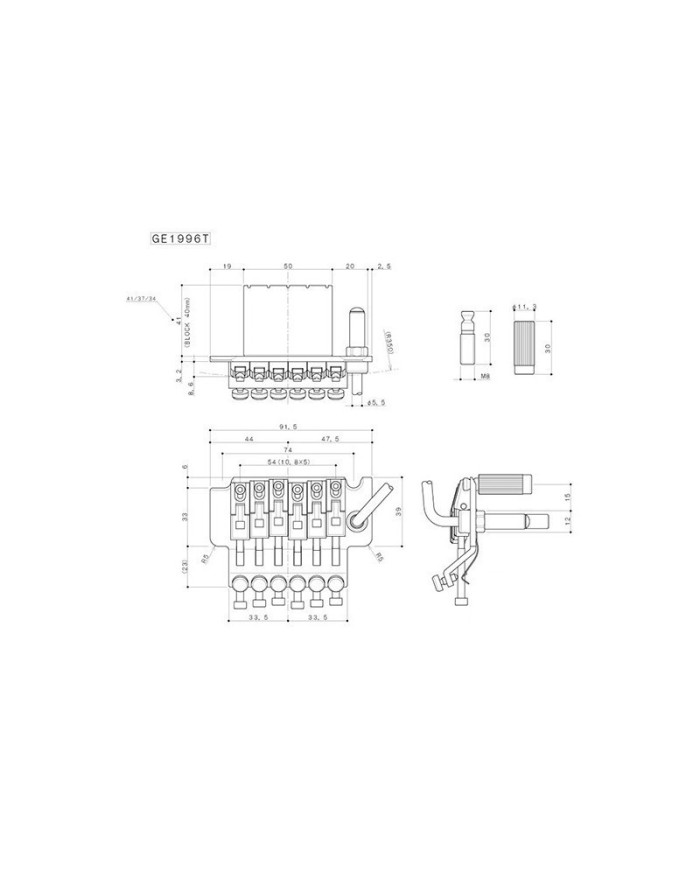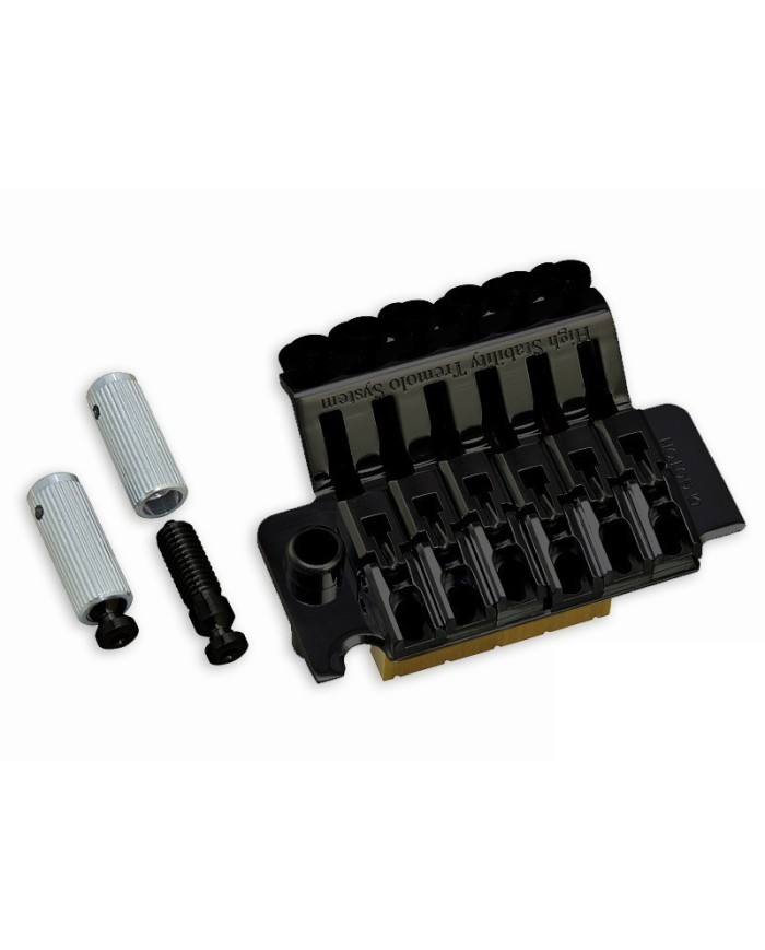 Cordier TREMOLO FLOYD ROSE, cordes traversant le Bloc Acier; 6 pontets blocables. Fourni avec les 2 vis de fixation, 2 vis et accrochage ressorts, bras Tremolo "simple push", clef Allen. Pour remplacement sur Stratocaster® 2 pivots : Attention ! l'entraxe entre les 2 pivots est de 74 mm et non de 56,8 mm comme sur les Tremolo Fender®.